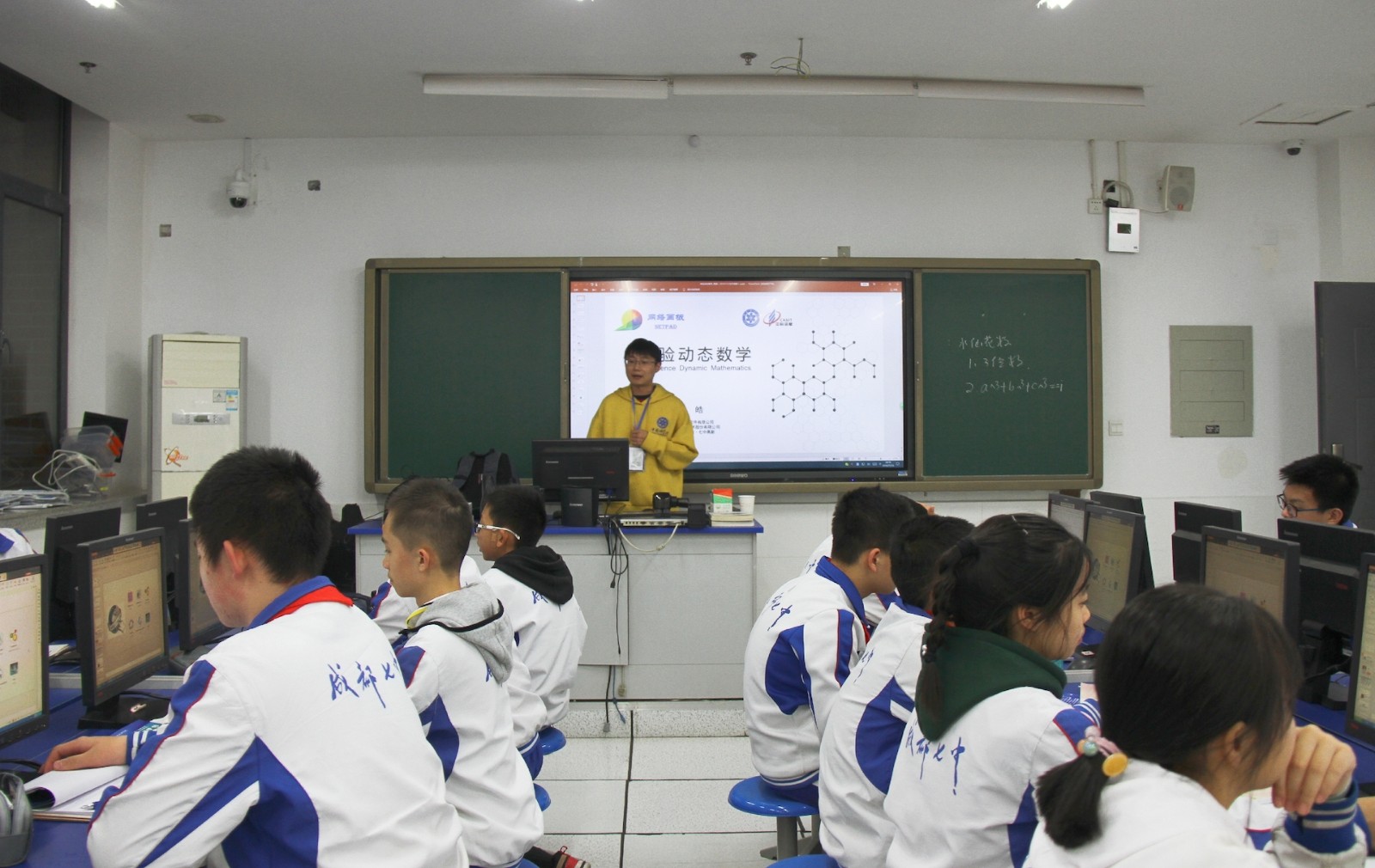 活動(dòng)啟動(dòng)儀式結(jié)束后,公司科普代表團(tuán)管皓博士以“體驗(yàn)動(dòng)態(tài)數(shù)學(xué)”為主題,給成都七中的學(xué)生們上了一堂生動(dòng)的幾何課。管博士師從著名計(jì)算機(jī)科學(xué)家、數(shù)學(xué)家張景中院士,主要研究智能教育軟件、計(jì)算機(jī)圖形學(xué)等方向。課上,他運(yùn)用張景中院士團(tuán)隊(duì)研發(fā)的動(dòng)態(tài)數(shù)學(xué)軟件向?qū)W生們展示了幾何學(xué)中的歐拉線、蘋(píng)果曲線、動(dòng)態(tài)曲面,并分享了動(dòng)態(tài)數(shù)學(xué)軟件在學(xué)習(xí)中的應(yīng)用案例。在互動(dòng)環(huán)節(jié)中,學(xué)生們踴躍參與,完全被動(dòng)態(tài)幾何的魅力所吸引,調(diào)動(dòng)起對(duì)數(shù)學(xué)的濃厚興趣。